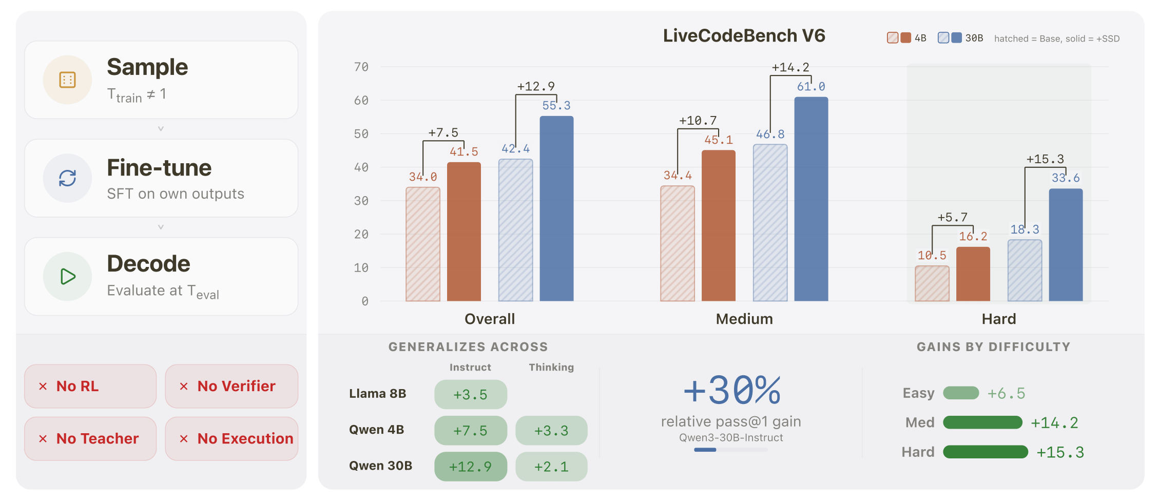 Simple self-distillation (SSD) is embarrassingly simple, yet yields substantial LiveCodeBench v6 gains across five models spanning two families, three scales, with both instruct and thinking variants.