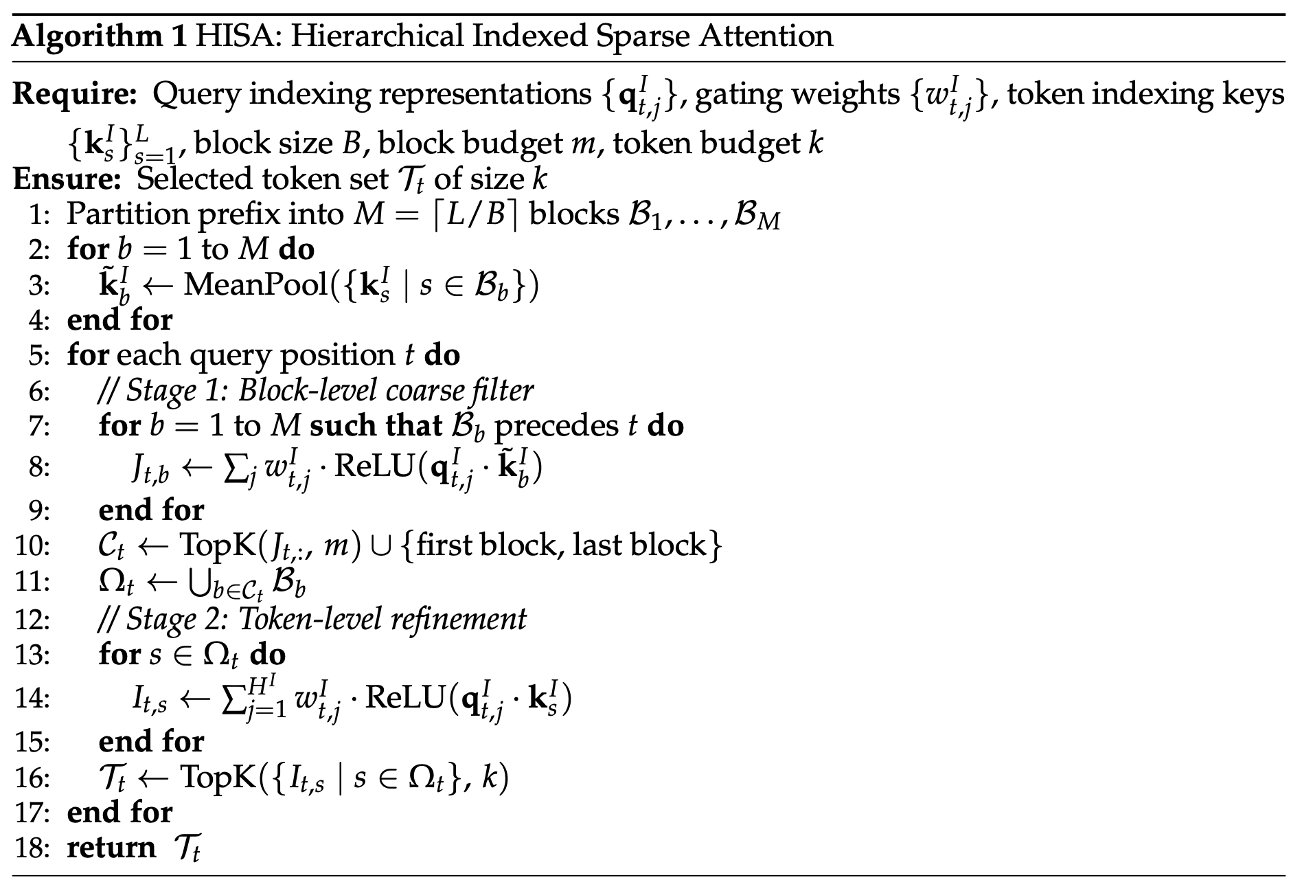 To solve this, researchers developed an elegant workaround called Hierarchical Indexed Sparse Attention. Instead of a flat, word-by-word scan, this new method uses a brilliant two-step strategy. First, it chunks the massive document into larger blocks and looks at a quick summary of each block to instantly filter out the irrelevant sections.