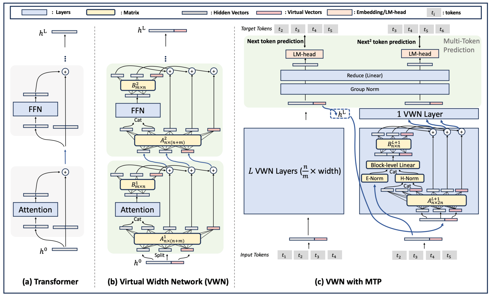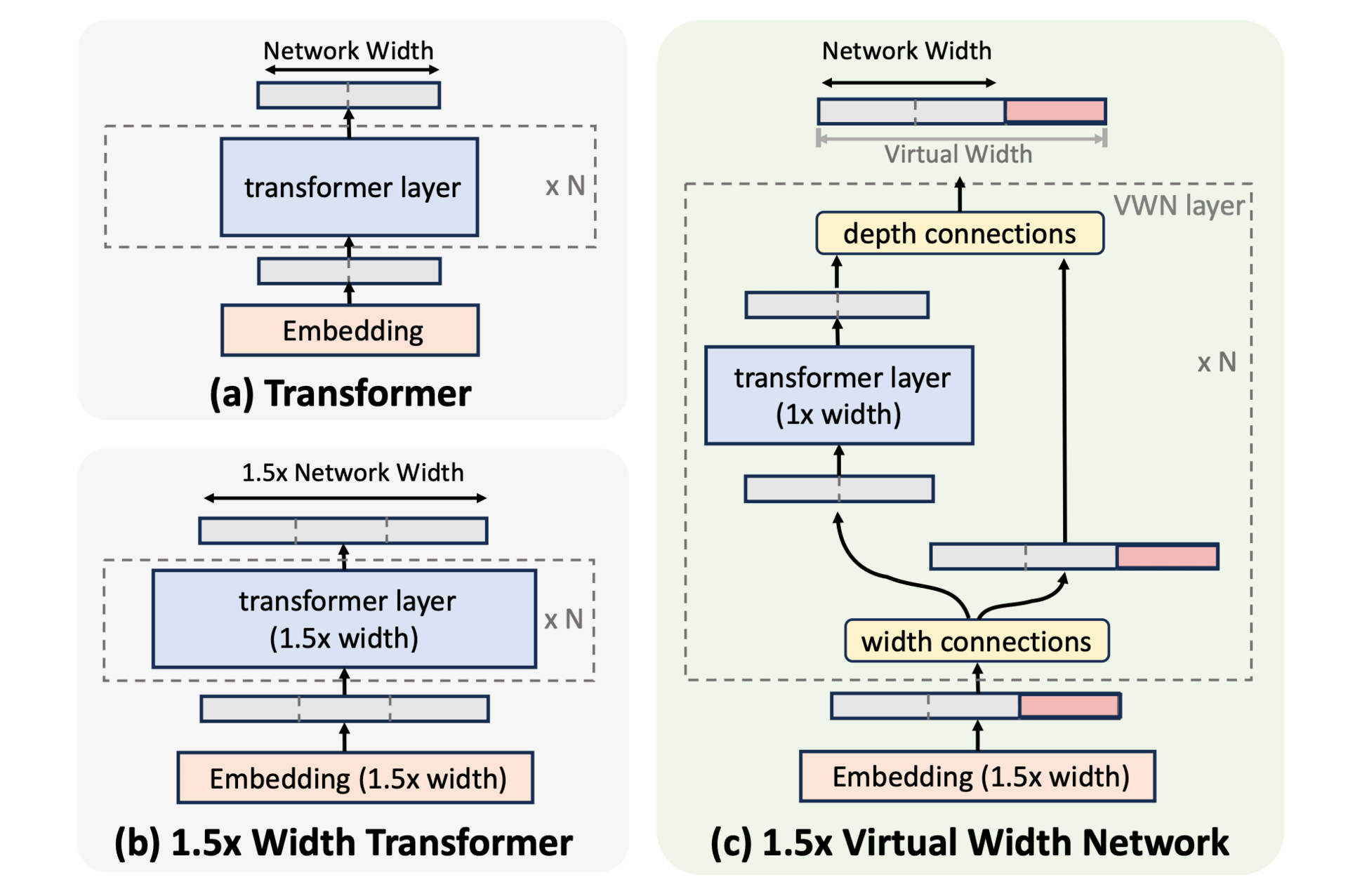 Standard Transformer vs. Virtual Width Network (VWN).