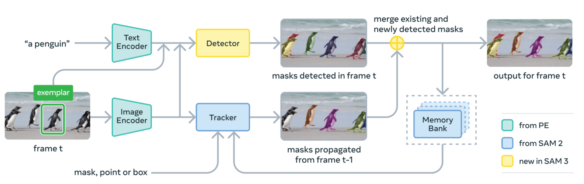 SAM 3 works by combining a detector and a tracker that share the same vision backbone. The detector identifies objects based on your prompt, using a special "presence token" that first decides if the concept is in the image at all. This separation helps the model focus better on where objects are located. The tracker then follows these objects across video frames, using memory to keep their identities consistent even when they move or get temporarily hidden.