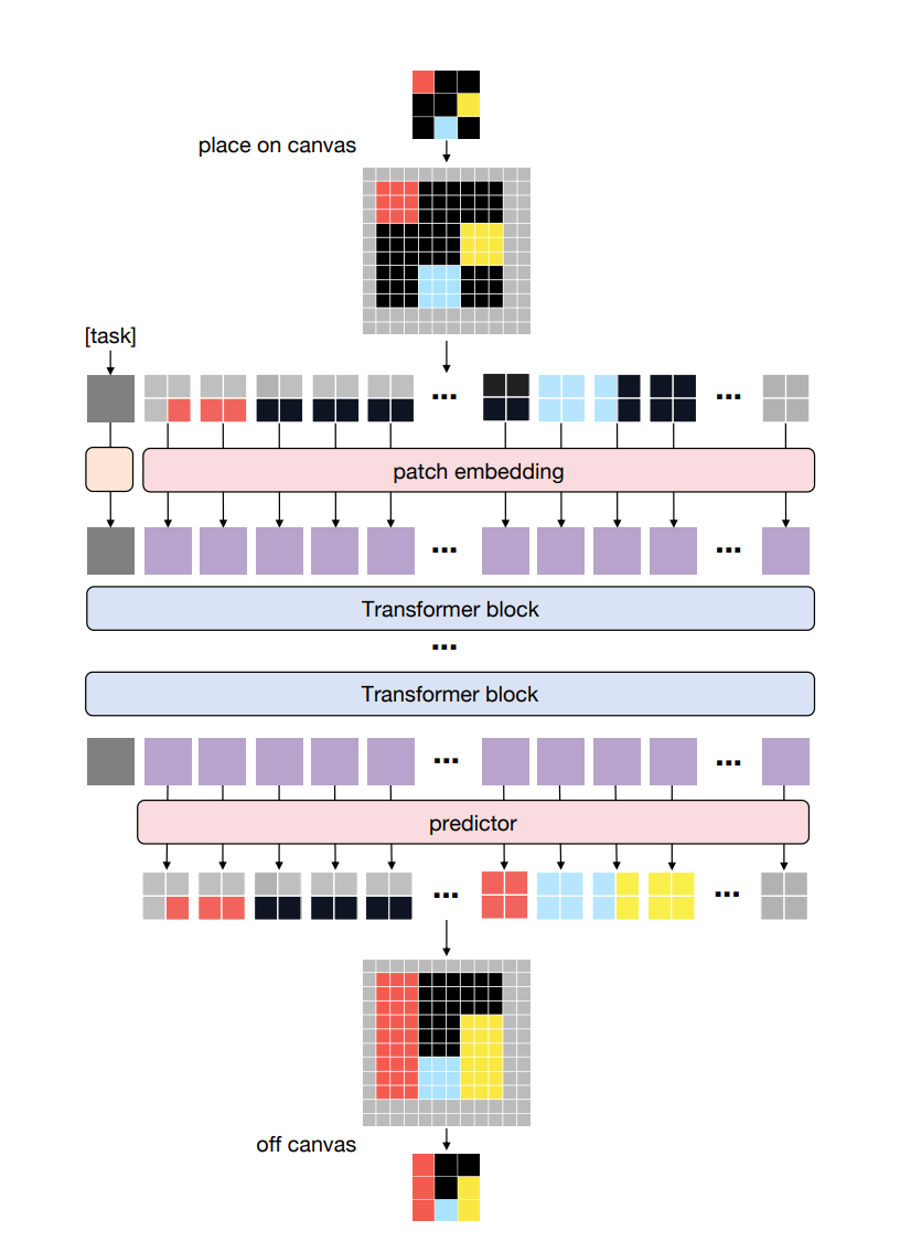 The method represents each task on a "canvas" that acts like a natural image, allowing standard vision models like Vision Transformers to process it. By using patches that group nearby pixels, the model learns spatial relationships and visual patterns rather than memorizing rules. This setup also supports data augmentations like scaling and shifting the input, which help the model generalize to new tasks it hasn’t seen before.