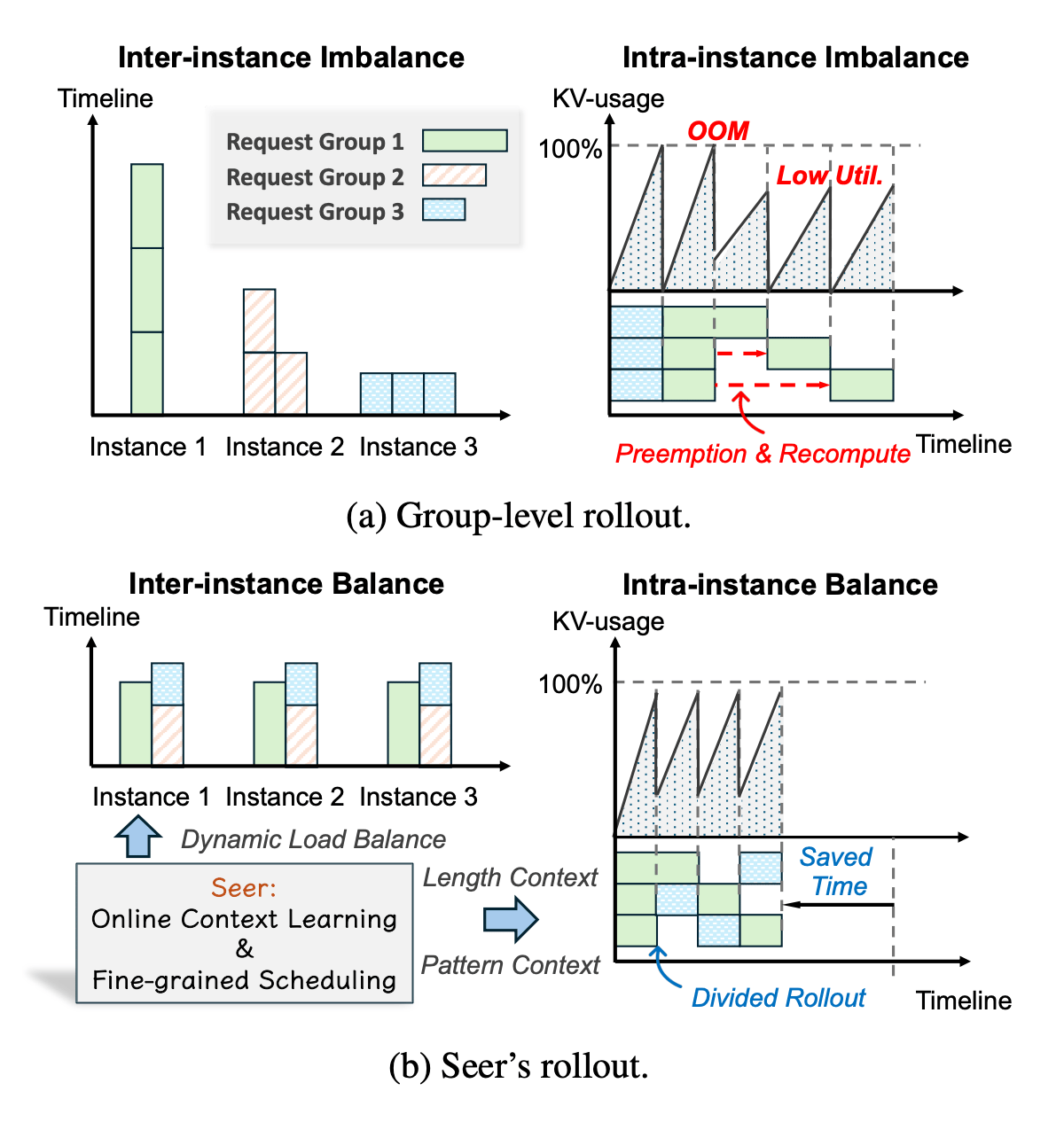 Reinforcement learning is important for training large language models, but the rollout phase often slows everything down due to uneven workloads and inefficient resource use. Seer tackles this by noticing that responses from the same prompt tend to have similar lengths and patterns, allowing it to balance the load dynamically and speed up the process.