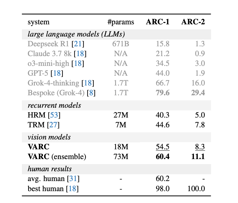 In tests, VARC achieved 60.4% accuracy on the ARC-1 benchmark when using an ensemble, matching average human performance. This shows that vision-centric models, trained only on ARC data, can compete with large language models that rely on internet-scale pretraining.