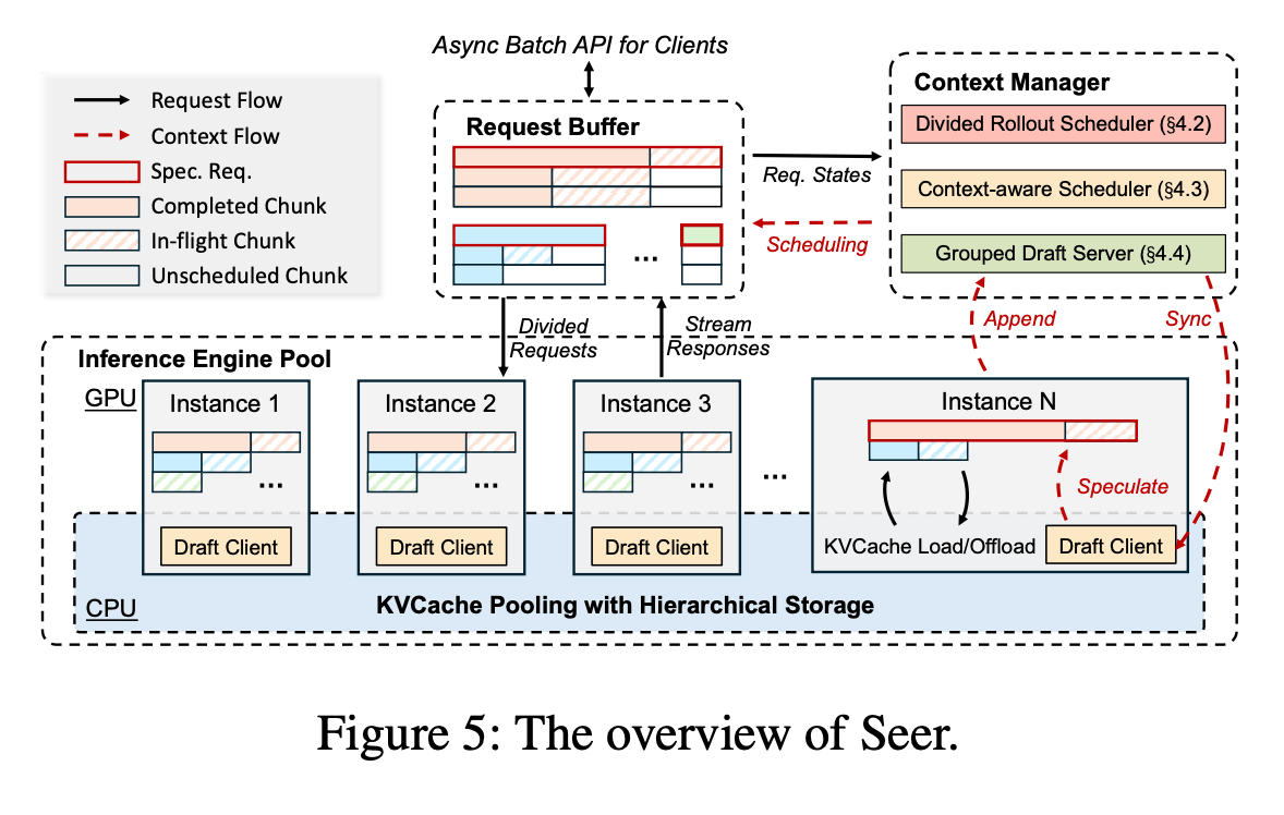 Seer splits request groups into smaller chunks and schedules them across instances to prevent memory issues and keep GPUs busy. It also uses an early "speculative request" to estimate how long each group will take, helping it prioritize longer tasks and maintain high batch density. Additionally, by building a shared draft token tree from similar responses, Seer enables faster speculative decoding without the overhead of traditional methods.