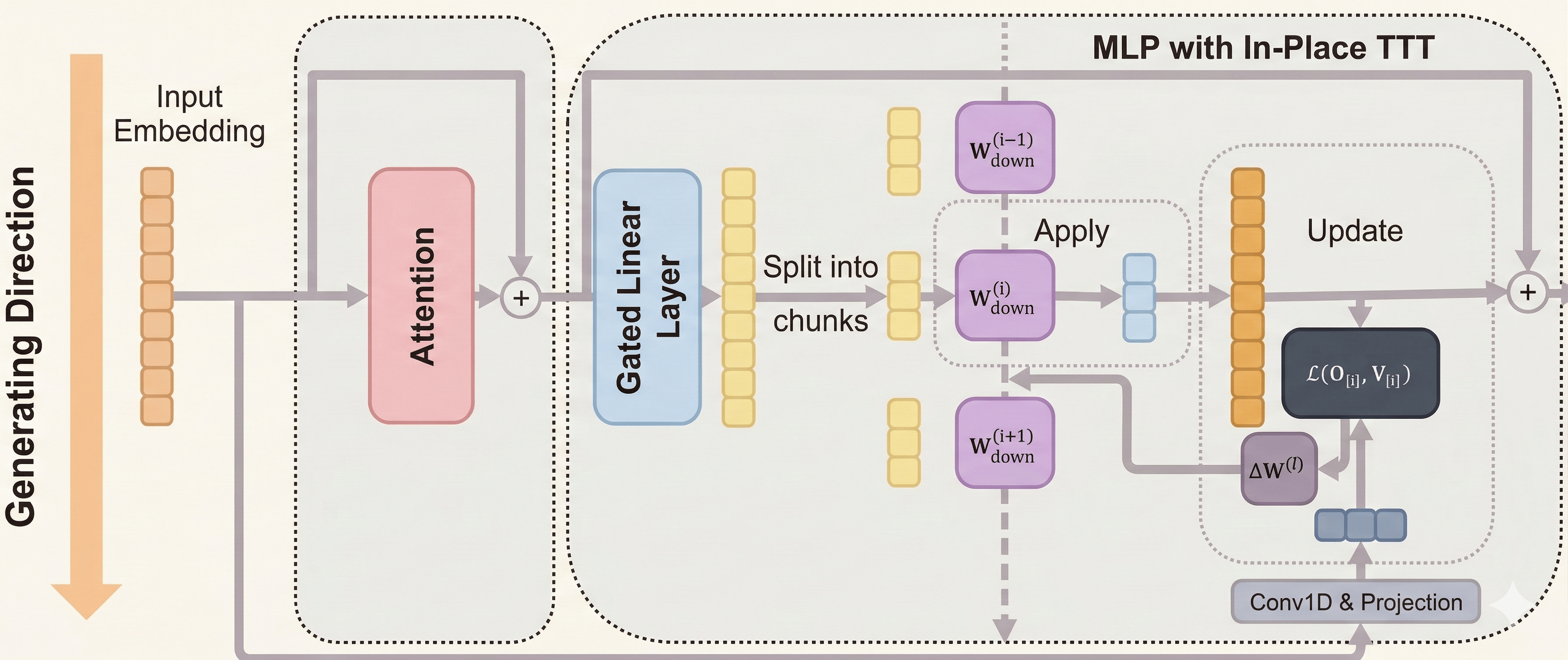 To overcome this, researchers designed a brilliant upgrade called In-Place Test-Time Training. Instead of bolting on brand-new components to the system, they realized they could simply repurpose existing ones. They targeted ubiquitous processing centers inside the model, known as MLP blocks, which normally store the static knowledge acquired during initial training.