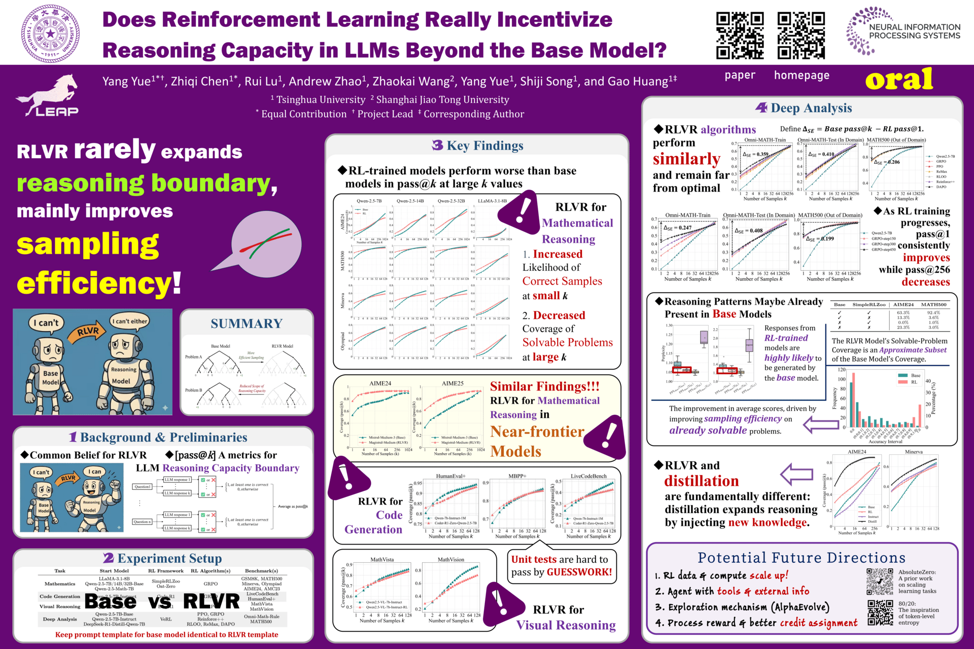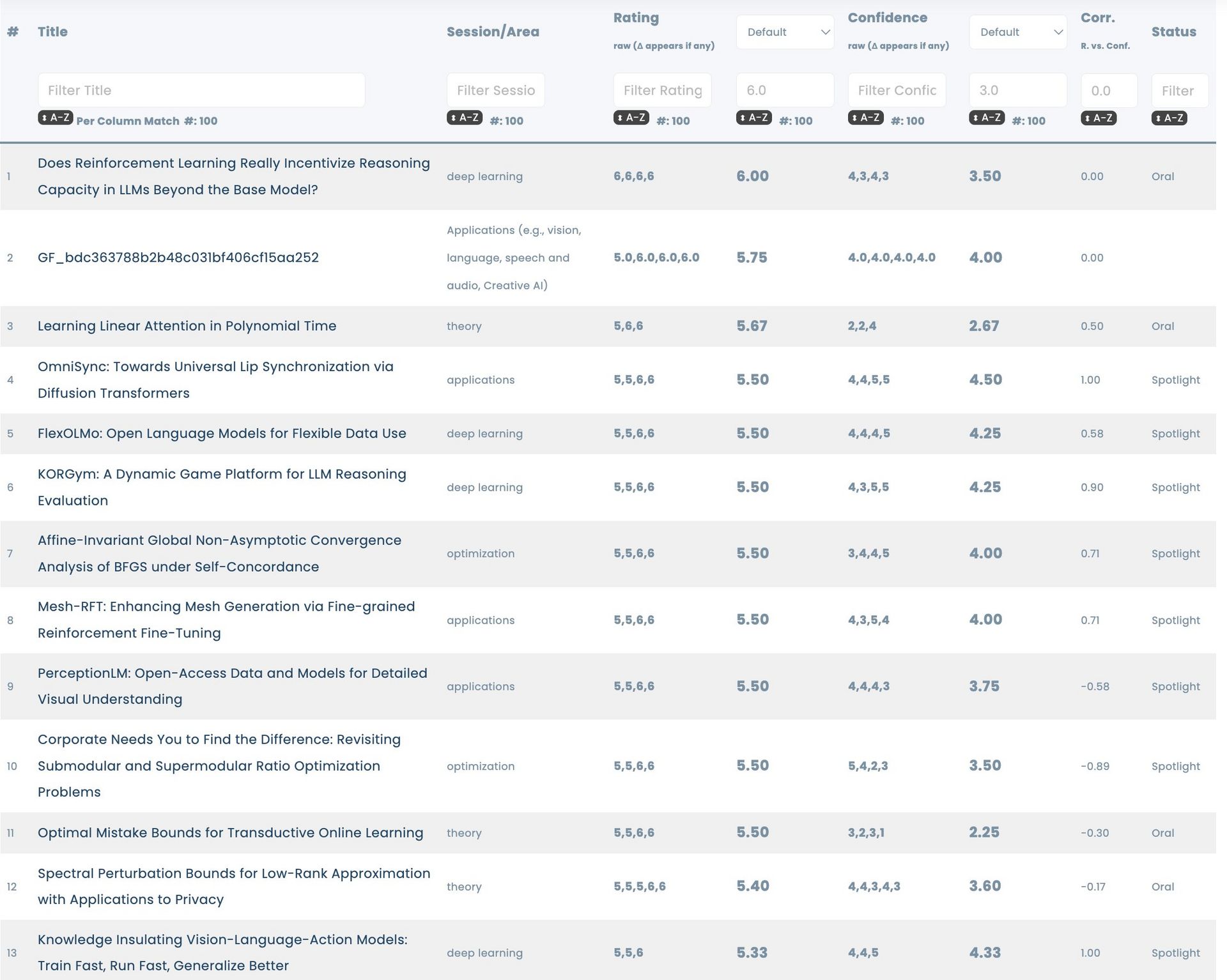 This paper called “Does Reinforcement Learning Really Incentivize Reasoning Capacity in LLMs Beyond the Base Model?” was published back in April, and in this year’s NeurIPS, it has received a staggering (6,6,6,6) score, which is the highest rating a paper can ever receive. It is also the only paper that has received the perfect score at this year’s NeurIPS.