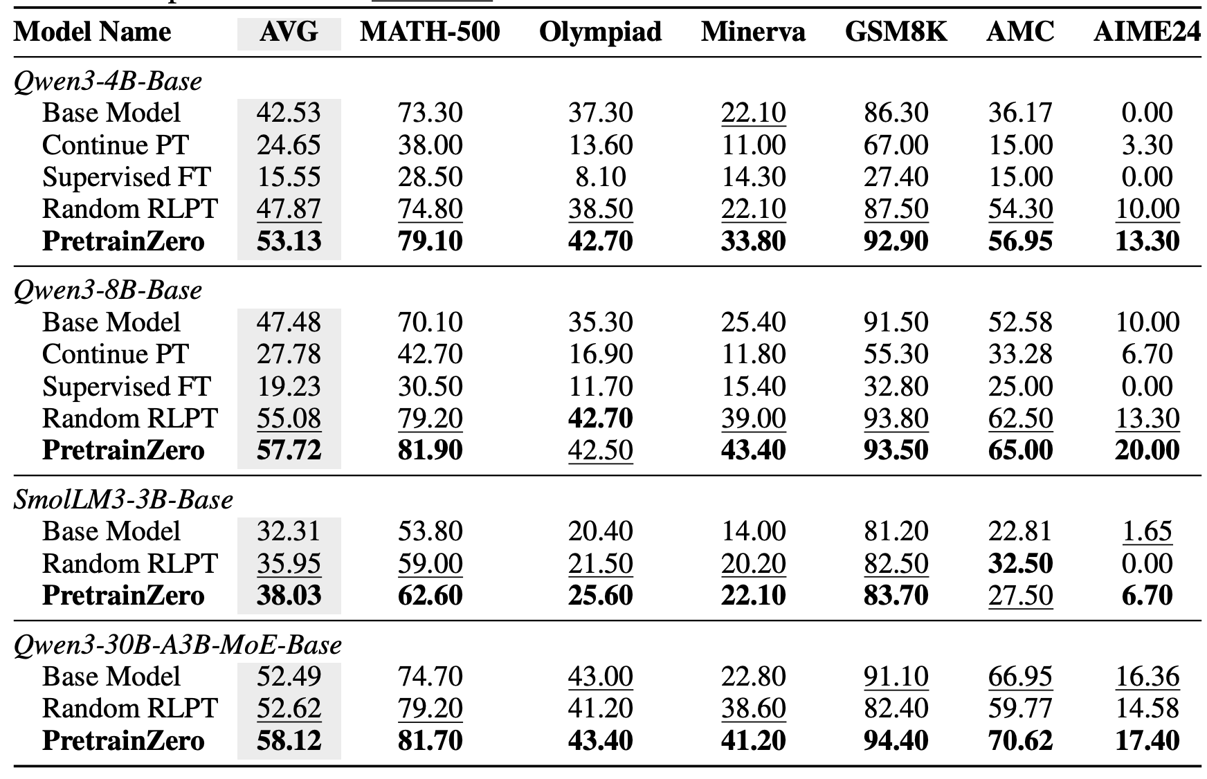 After reinforcement pretraining with PretrainZero, the model showed significant gains on tough benchmarks like MMLU-Pro and mathematical reasoning.