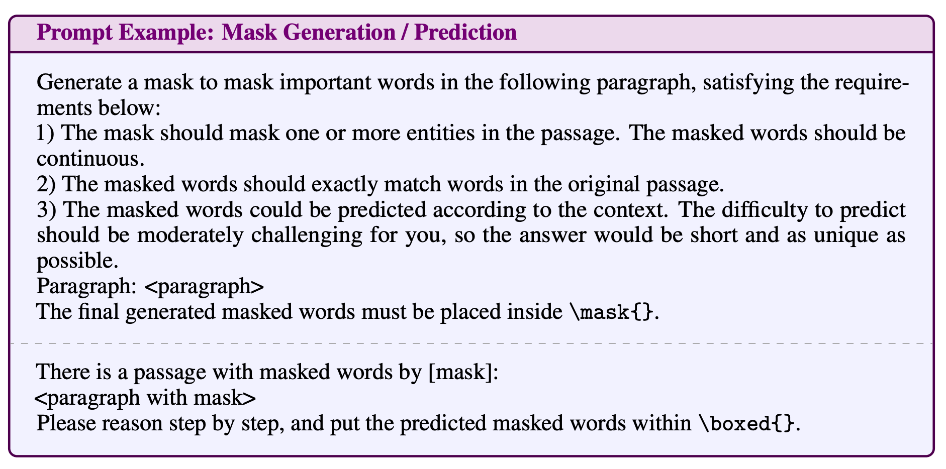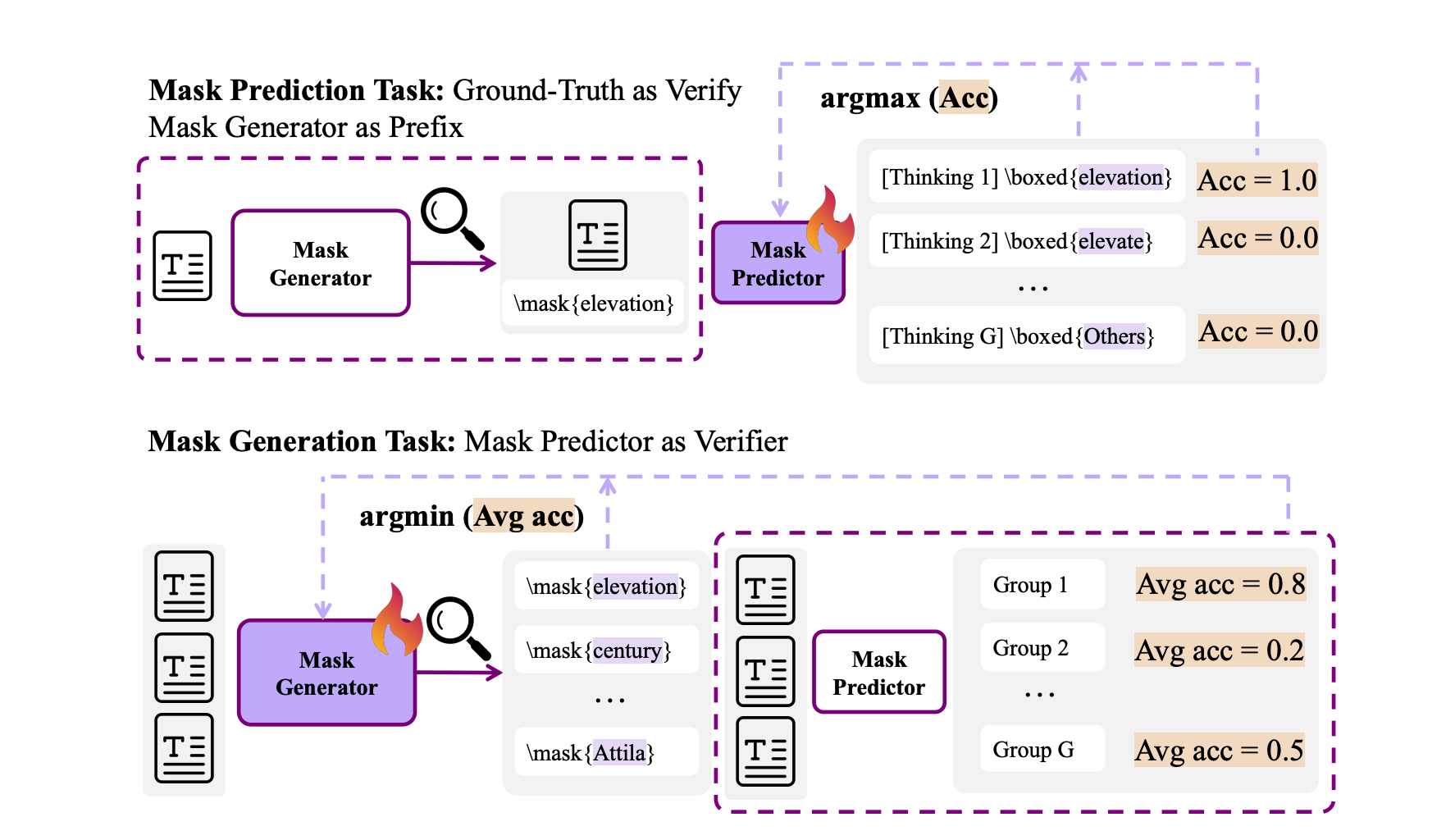 The main idea is to have the model actively decide what to learn from a massive text corpus, like Wikipedia. Instead of passively predicting every next word, the system uses two parts working together. One part acts as a mask generator, scanning text to pick out specific, informative spans of words to hide. Think of it as a student choosing the most valuable practice questions from a textbook. The other part, the mask predictor, then tries to reason through and fill in those hidden spans. The two parts are trained jointly: the generator learns to propose masks that are reasonably challenging for the predictor, and the predictor improves its reasoning to solve them.