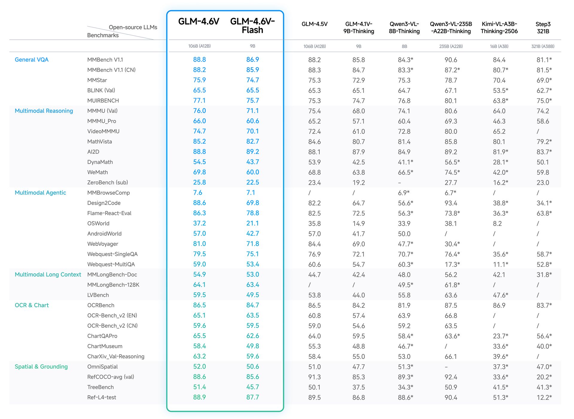 ♥ 1.6k Z.ai introduces GLM-4.6V, which is a 106B vision-language model with 128K context capable of multimodal input, interleaved image-text generation, and function calling. While the 9B GLM-4.6V-Flash offers low-latency performance for local use. Both models support end-to-end search, reasoning, and video analysis with strong frontend development capabilities.