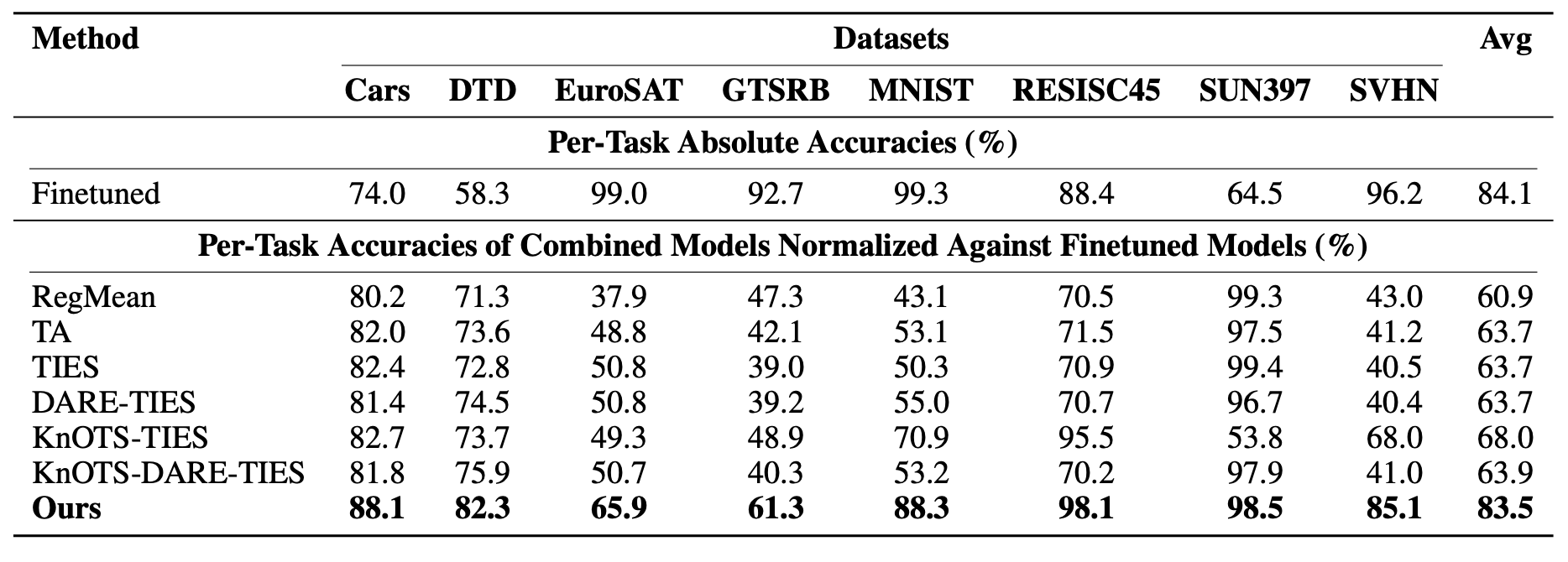 Per-task results for eight ViT-B/32 models, each finetuned with LoRA on a different image classification dataset.