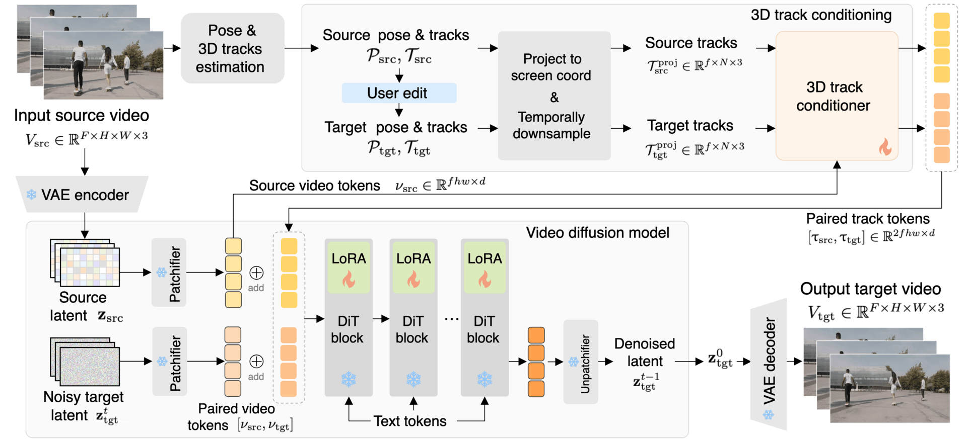 The system works by first estimating the 3D path of points in the source video. Users can then edit these paths to define new motions for the camera or objects. A special component called the 3D track conditioner is key; it uses the original video frames and the edited 3D tracks to intelligently sample visual details and project them into the new video. Unlike simpler 2D methods, these 3D tracks provide depth information, which helps the model correctly handle occlusions and the order of objects in space, leading to more precise edits.