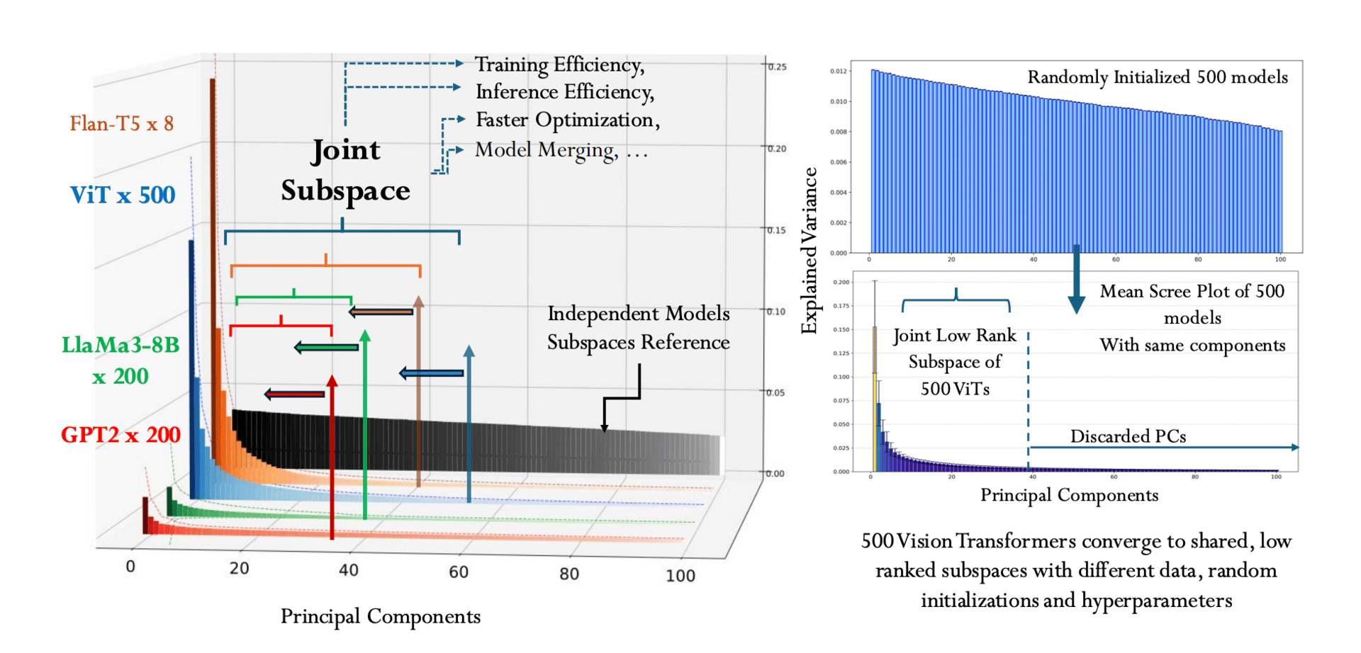 The researchers looked at over 1100 models, including 500 Vision Transformers and 500 Mistral-7B LoRA adapters. By applying spectral decomposition to the models' weights, they found that the vast majority of each model's important information is captured by just a handful of principal directions. It’s as if, regardless of what a model was trained to do (recognize images, understand text, or generate content) its parameters end up living in a shared, low-dimensional neighborhood defined by its architecture.