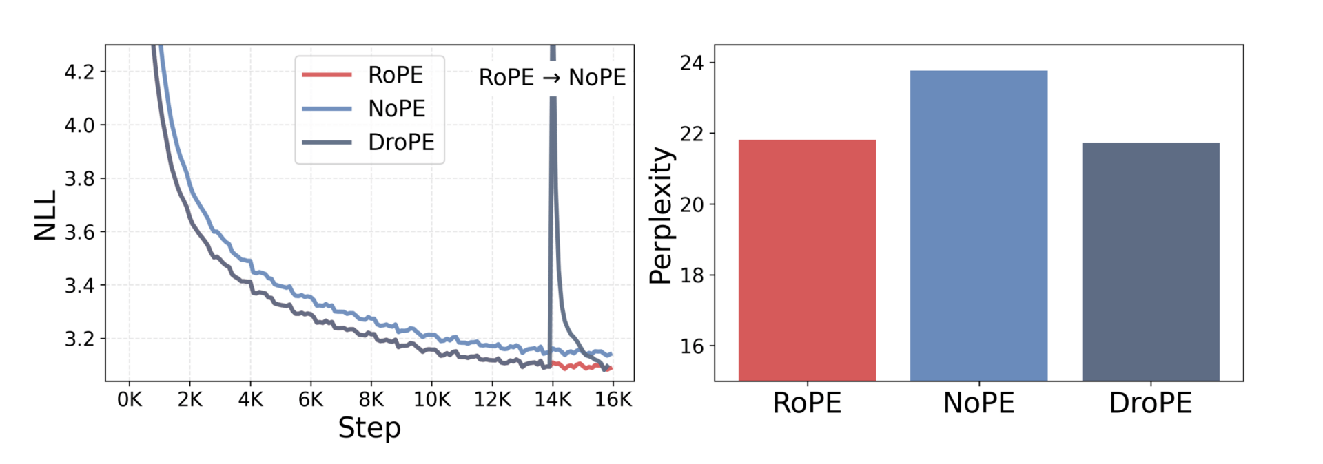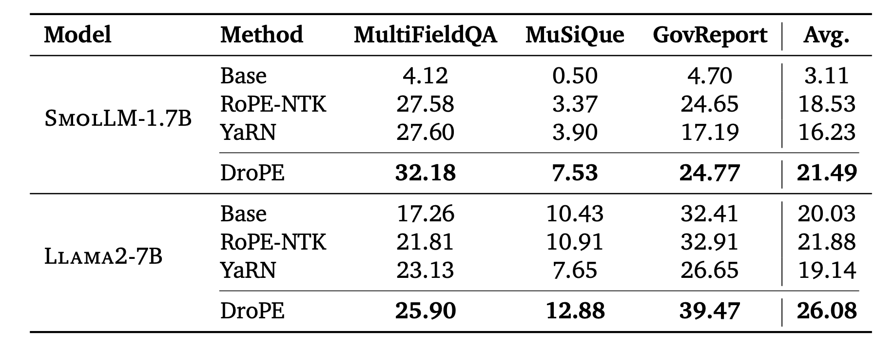 By simply removing these embeddings after the initial training (a method they call DroPE), the model acts more flexibly. Surprisingly, once these rigid guides were removed and the model underwent a very brief recalibration, it could immediately understand and retrieve information from sequences far longer than anything it had seen before. This method effectively unlocks long-context capabilities without compromising the model’s performance on standard tasks.