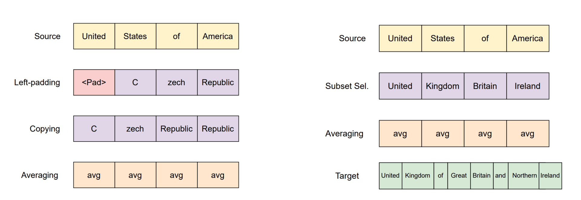 STEM-based knowledge editing schemes for length-mismatched source (ns) and target (nt) entity tokenizations.
