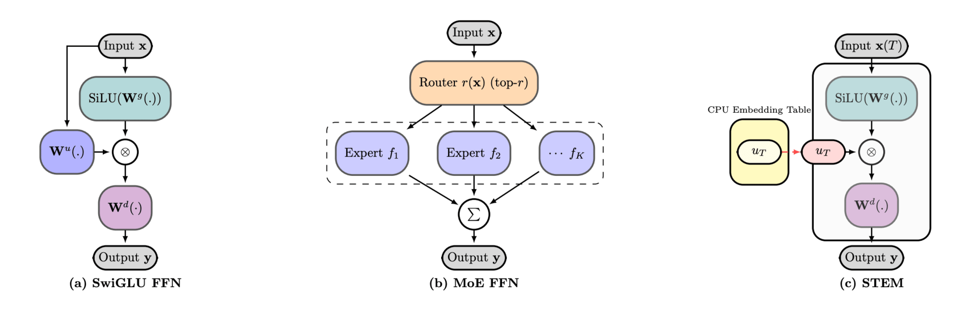 Schematics of (a) SwiGLU FFN, (b) MoE FFN, and (c) STEM with a single prefetched token embedding.